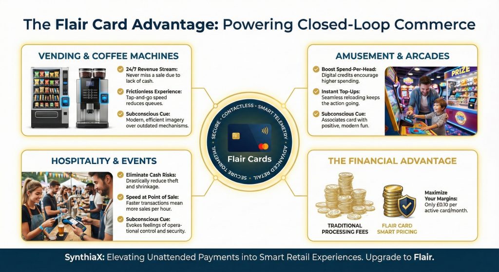 Works seamlessly with any MIFARE NFC card and integrates with all SynthiaX payment terminals. Supports MDB, Pulse, and VCCS protocols.